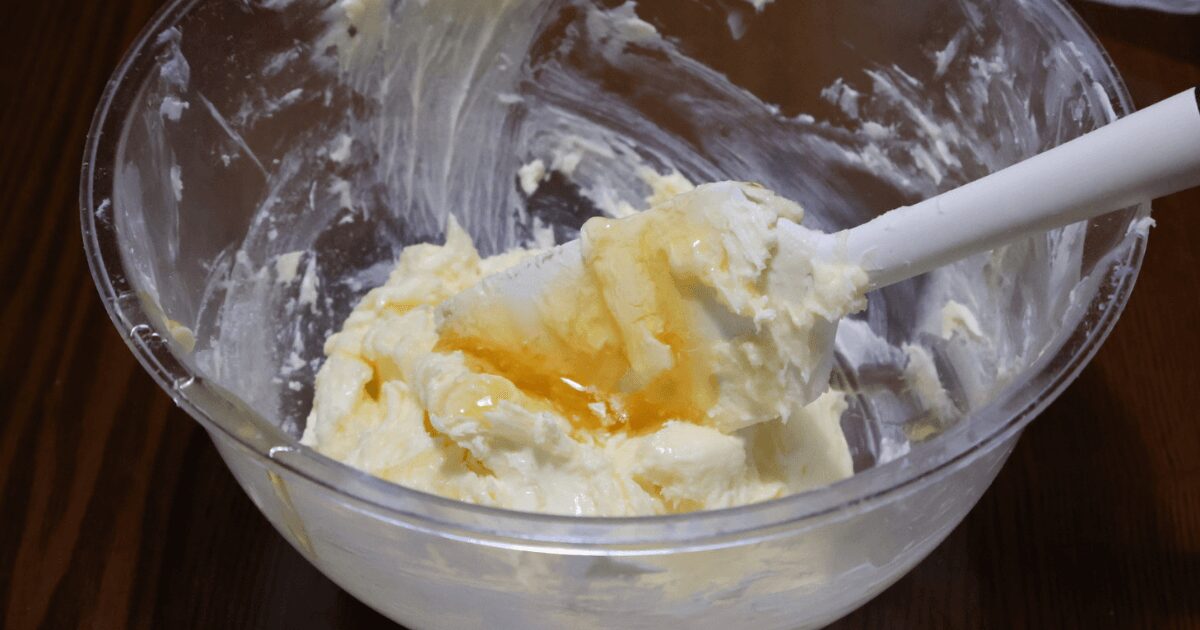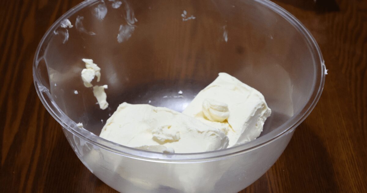 冬場はクリームチーズが中々常温に戻らないので、押して指がスッと入る程度の固さになるまで、レンジで温めると良いです。(温めすぎに注意する)