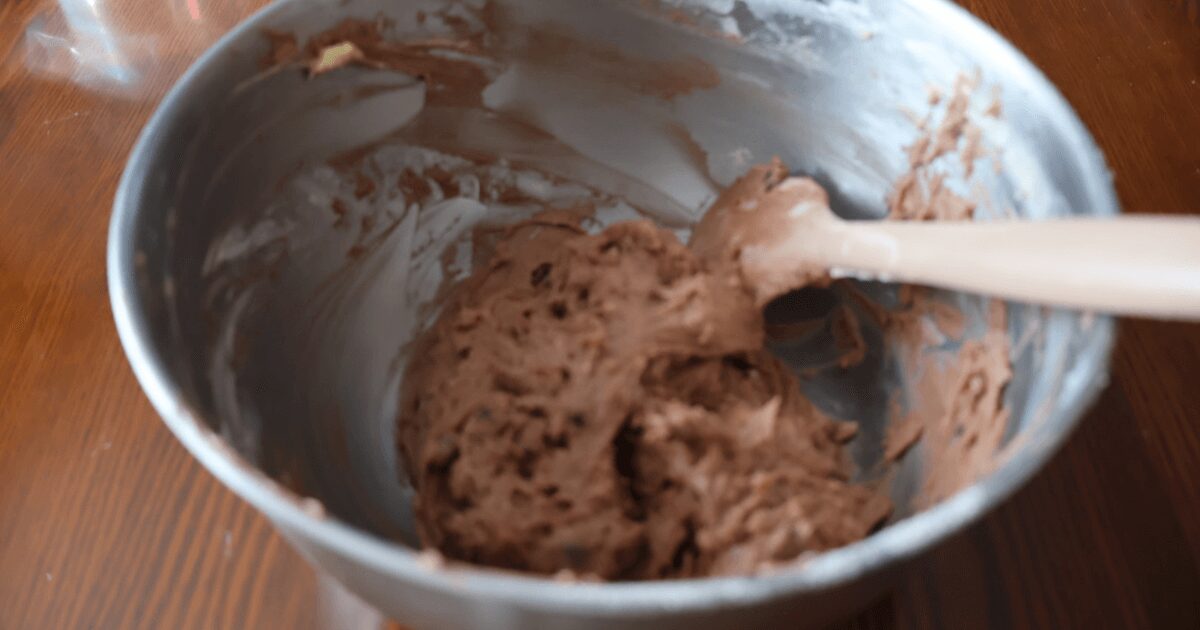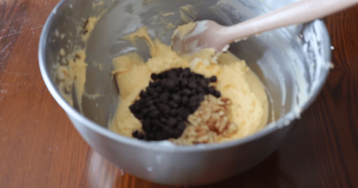 くるみとチョコチップを加えて、ハンドミキサーからゴムベラに持ち変えて軽く混ぜ合わせる。